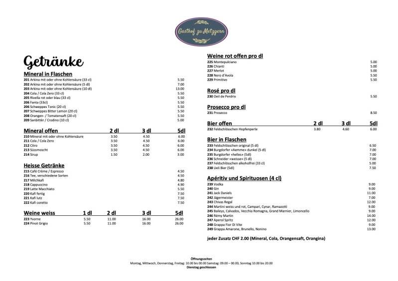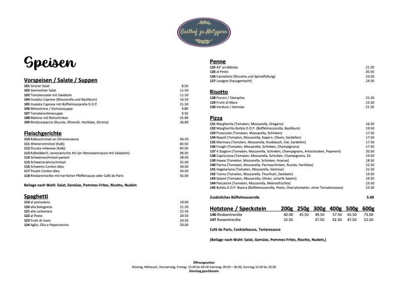Willkommen bei Gasthof zu Metzgern! Unsere Speisekarte bietet eine vielfältige Auswahl an köstlichen Gerichten, die von unserem leidenschaftlichen Küchenteam frisch zubereitet werden. Von traditionellen Schweizer Spezialitäten bis hin zu internationalen Köstlichkeiten - bei uns ist für jeden Geschmack etwas dabei.